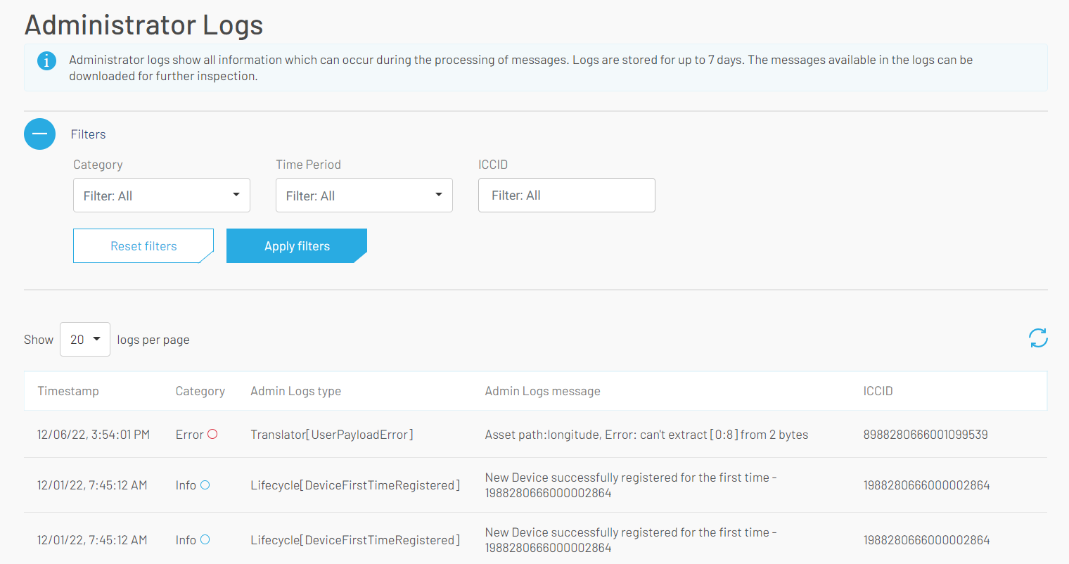 Open the Admin Logs in 1NCE OS to see the latest logs from the devices. At the top, the filter can be used for searching on ICCID, Category or the Time Period. The last 5 Admin Log Events and Errors are shown on the dashboard.