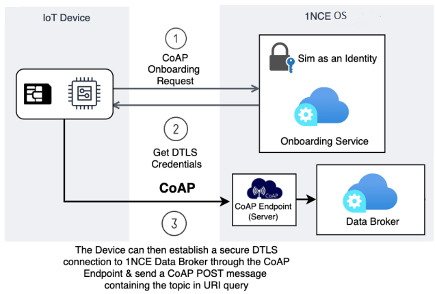 Ensuring, data is securely sent from a device to 1NCE OS, it is an important part of gaining the trust of customers with their data. To be able to provide this secure connection 1NCE OS has implemented a DTLS layer in the CoAP communication from the device to 1NCE OS. This allows the device to securely send its data to 1NCE OS without the possibility of messages being read or modified along the way. The picture above describes this process. First, when the device is ready to onboard itself, it will call the CoAP bootstrapping endpoint. This will retrieve the necessary DTLS info to onboard itself securely and initialize the CoAP connection using a PSK.