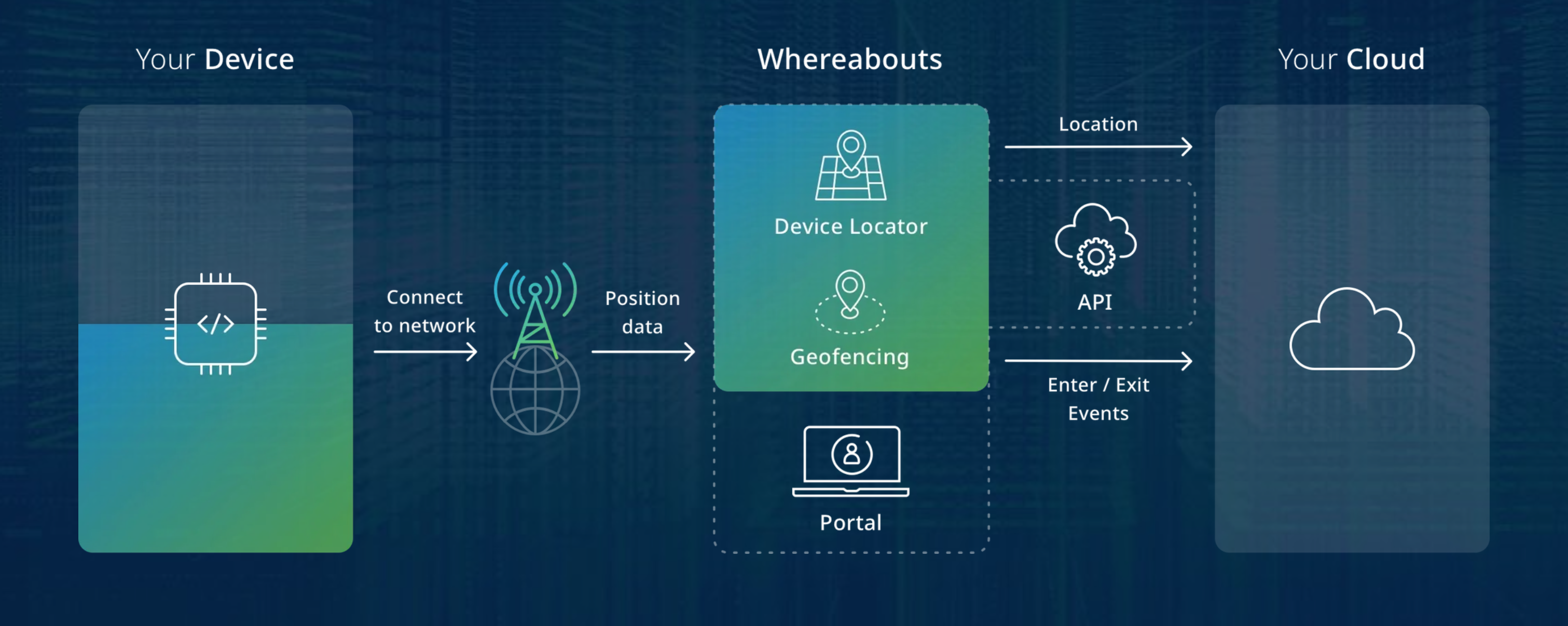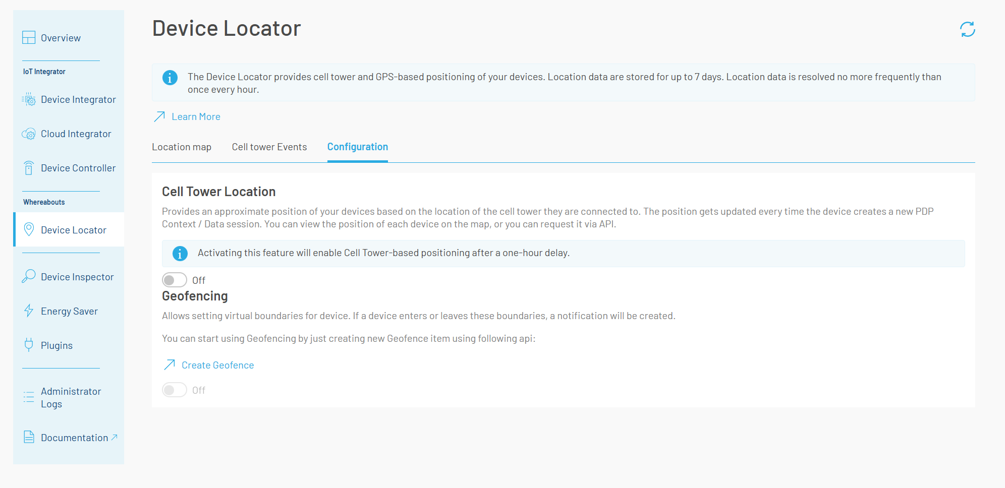 The Geofencing Service allows setting virtual boundaries for devices. If a device is crossing a geofence (entering or exiting, configurable), a geofence event will be generated and sent to the customer's Cloud Integrator Webhook integration or the AWS Integration.