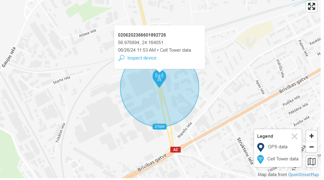 New metadata field is also added with accuracy data. In the following example, the circle around the point on the map indicates that there is a 68% probability that the device is within a 270-meter radius of the provided location.
