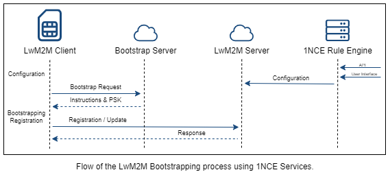 To use the 1NCE LwM2M Service, every time a client IoT device with a 1NCE SIM wants to connect or reattach, the bootstrap server needs to be contacted at first. A direct connection to the LwM2M server without prior communication towards the bootstrap service is not possible.