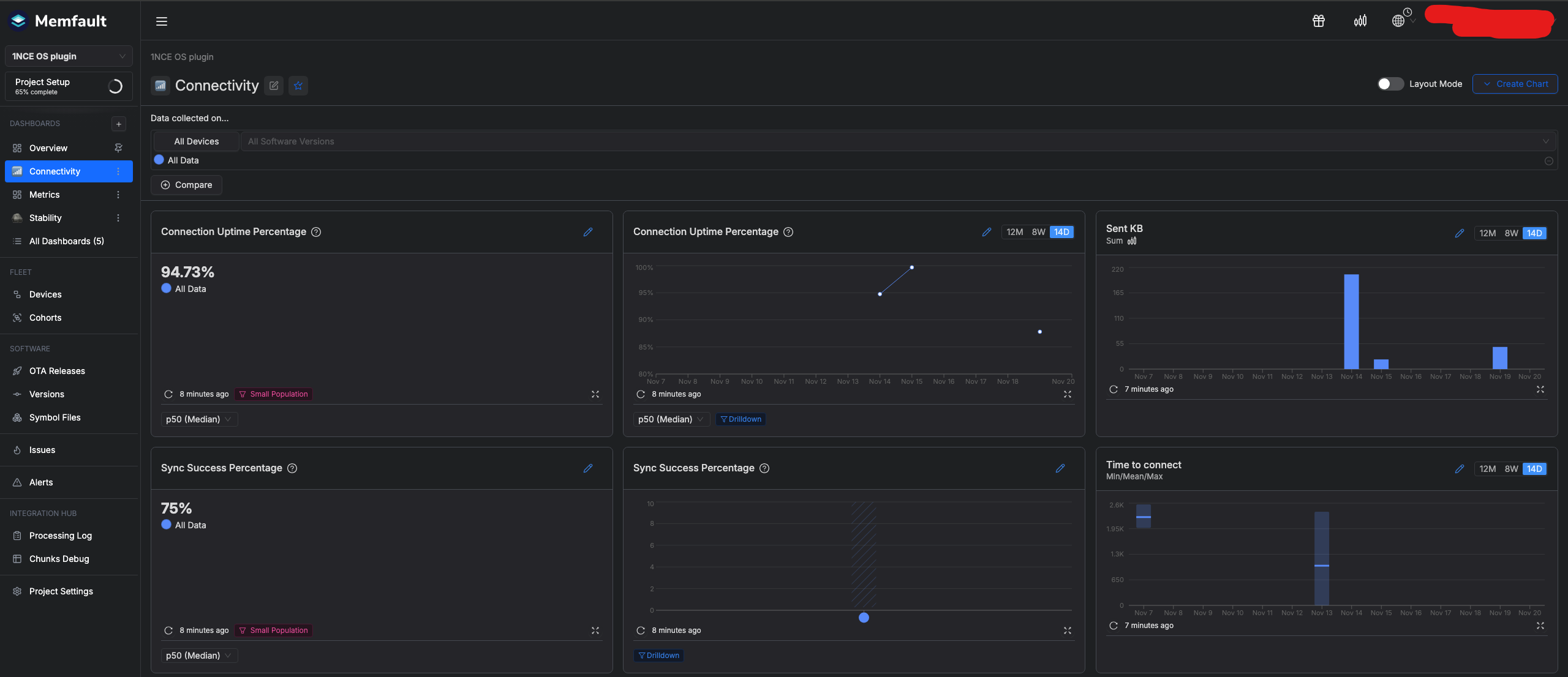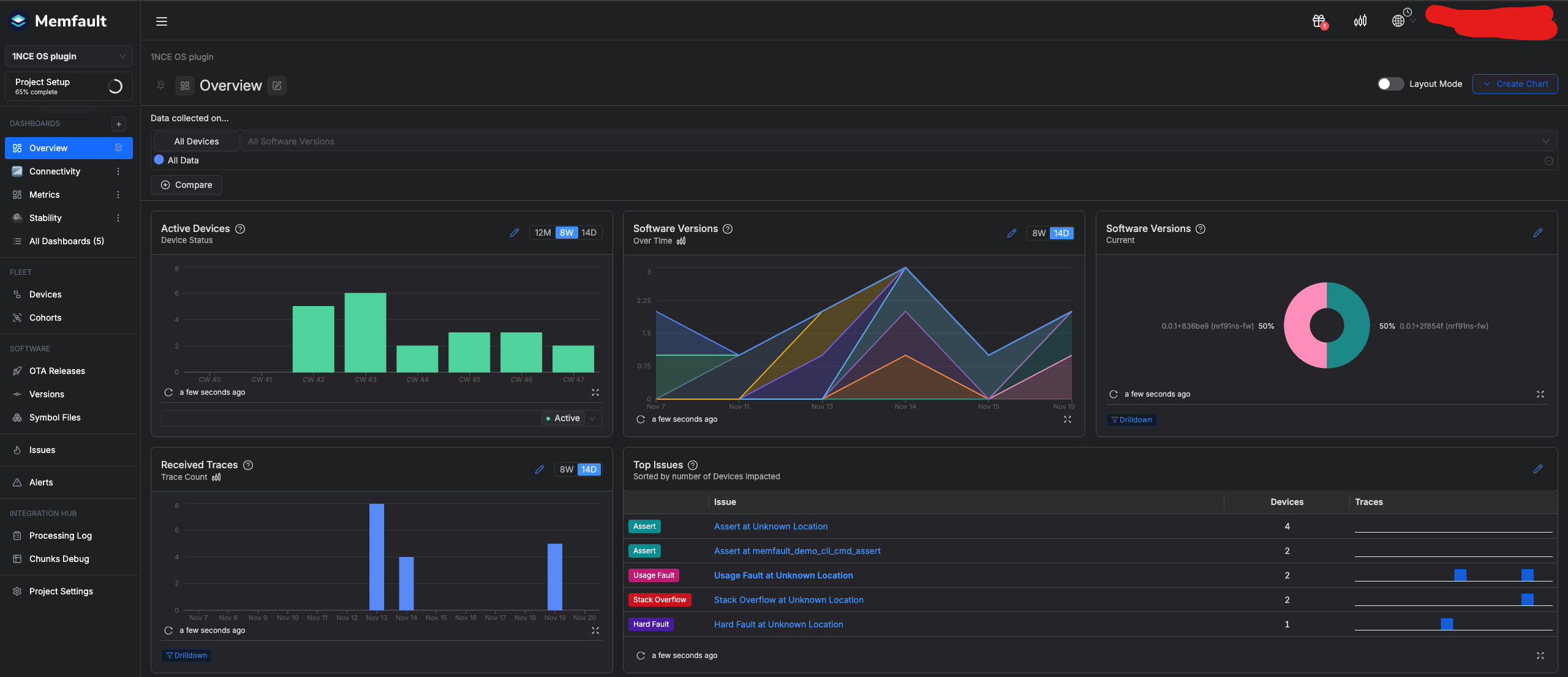 After devices start to send data to the Memfault system, you can start monitoring different aspects of your device fleet.