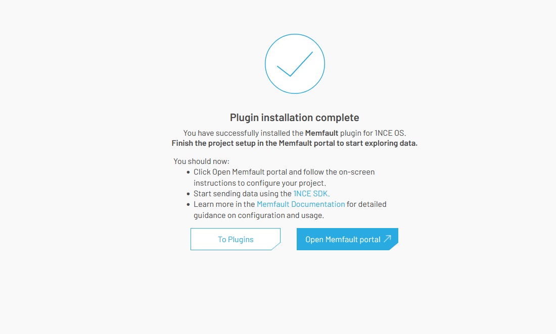 The Plugin can be installed in 1NCE OS portal "Plugins" tab by choosing "Memfault."
