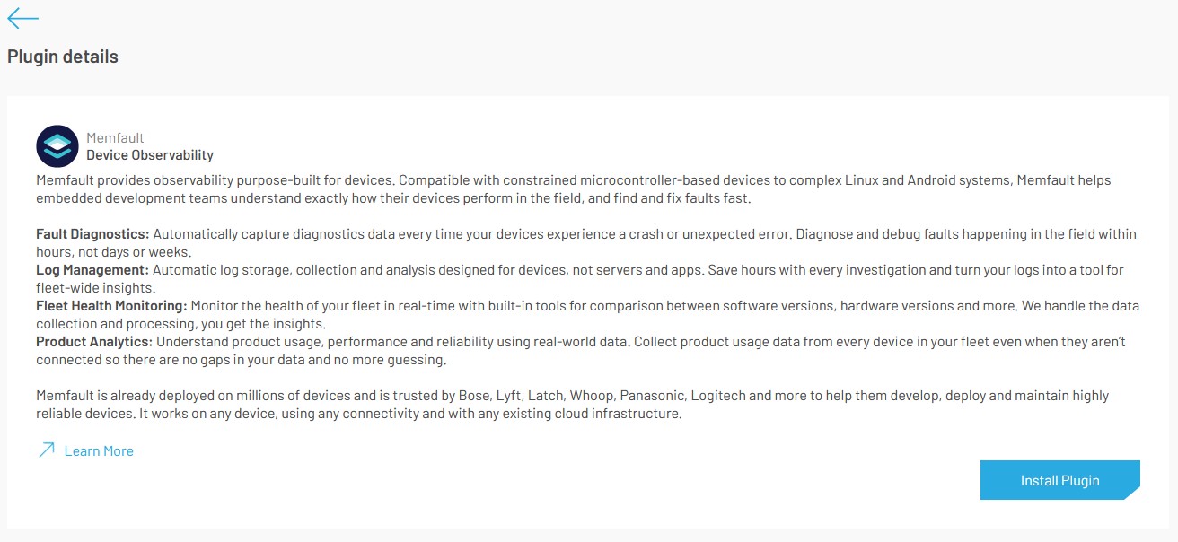 After registration in the Memfault portal is completed you should see the following plugin details page, where we provide details about the Memfault plugin and the "Memfault portal" link to easily navigate to your Memfault account.
