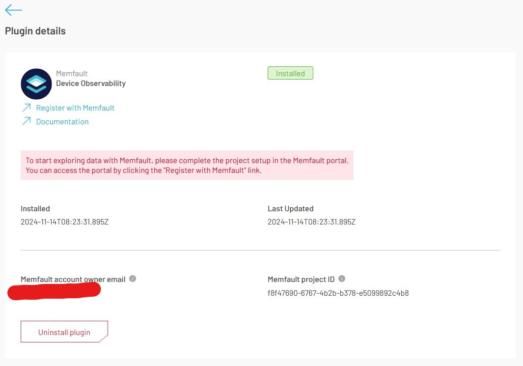 In case you navigate away from the "Plugin Installed" page you can still get the Memfault registration URL by navigating to the Memfault plugin details and clicking on the "Register with Memfault" link.
