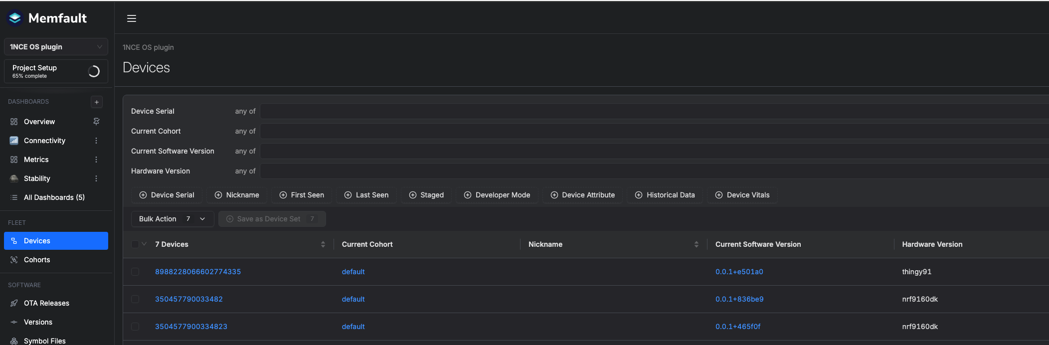 After Memfault plugin installation is done you can utilize Demo script for zephyr to start sending chunks data to the Memfault system. If chunks are processed successfully, the device will show up in the Memfault portal on the Devices page automatically with the ICCID of the 1NCE sim card used as a device serial number.