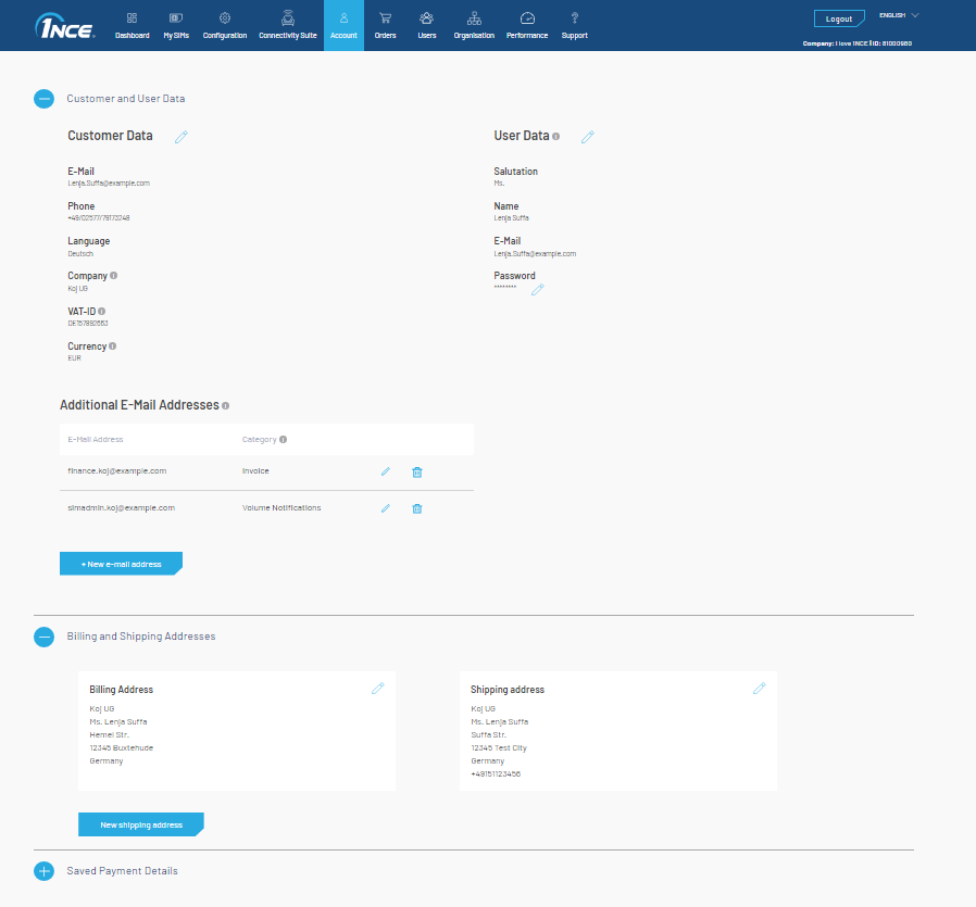 In the Customer and User Data dropdown, the contact information and account details for the root organization and for the logged-in user can be viewed and changed. Note that the e-mail address shown in the Customer Data column is the main contact where all invoices are being sent to digitally. An additional e-mail address can be stored which receives the invoices in copy, for example the accounting department. Please select the category "Invoice" for that.