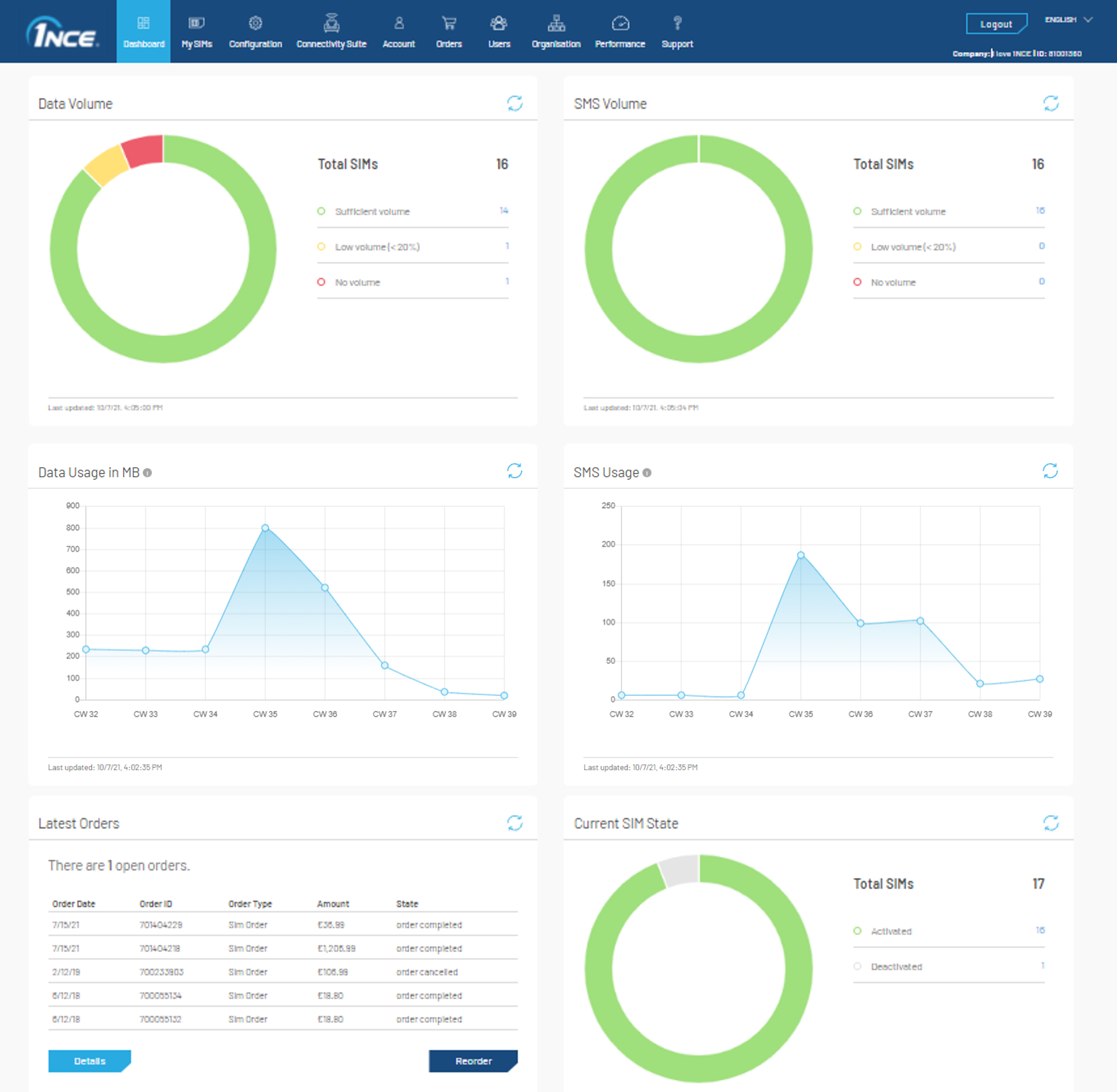 After logging into to the 1NCE Customer Portal, an overview Dashboard is presented. The page shows the current SIM status, volume usage and a current order overview from the organization.