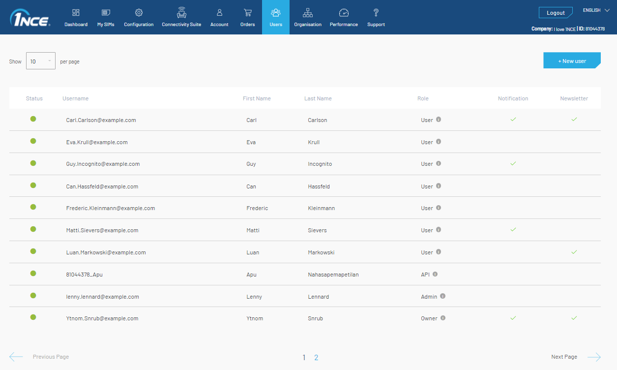 The 1NCE Customer Portal offers the option to create multiple user accounts which allows for different user roles and access rights. In the "User" tab a root owner of the account can create and edit new user accounts. A general overview of all current users of the 1NCE organization is provided in a list view.