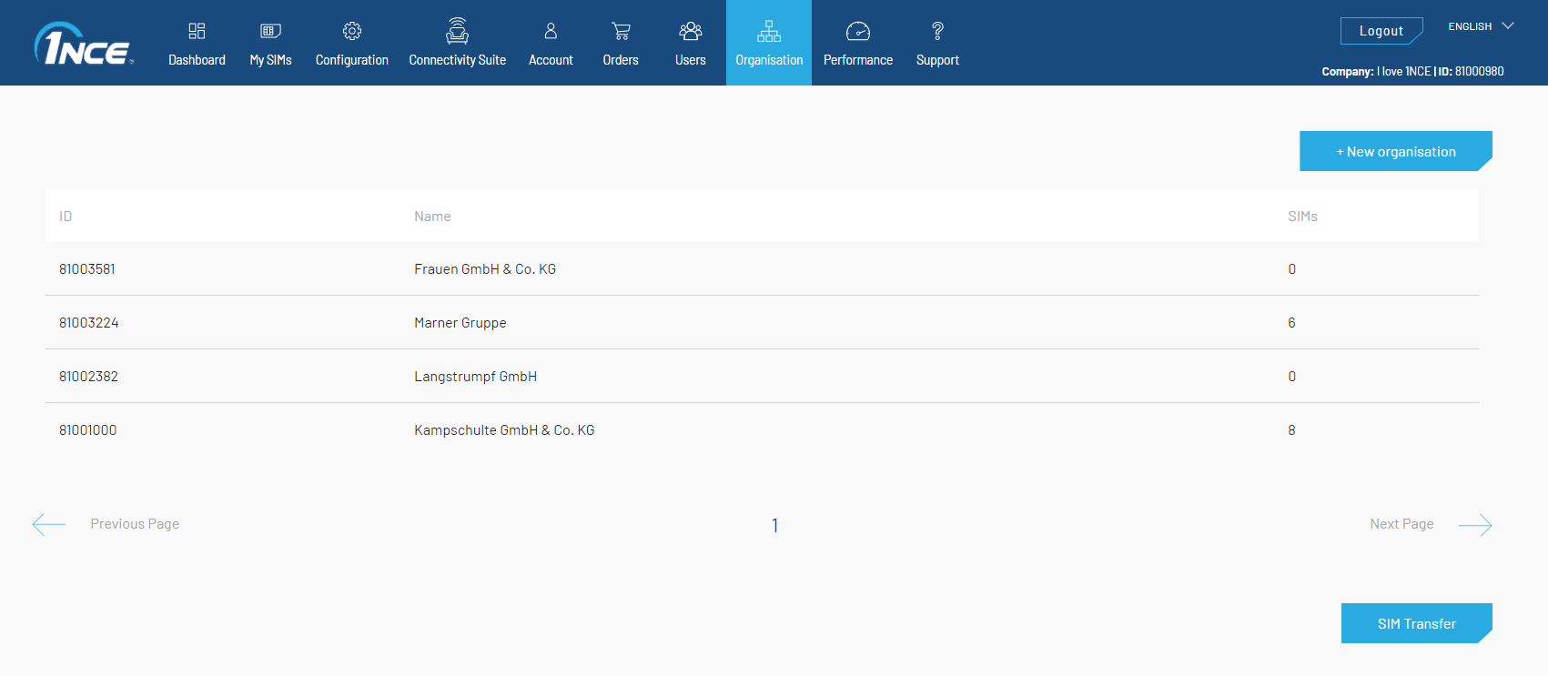 In the "Organisation" tab, a list of all sub-organizations of the main 1NCE user account are shown and can be managed. This feature enables a customer to create independent organizations, e.g., for their subsidiary or sub-contractor.