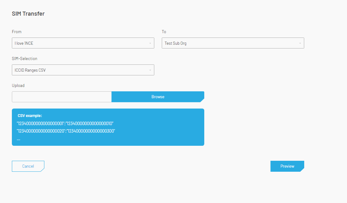 If there are any sub-organizations, the "Organization" tab also offers the possibility to transfer SIMs from the master organization and vice versa. A direct transfer from sub- to sub-organization is not possible. The transfer of SIMs can also be done using the 1NCE API. Customers can transfer just one single SIM, a range of SIMs, or several ranges of SIMs. Here are some helpful tips for transferring several ranges: