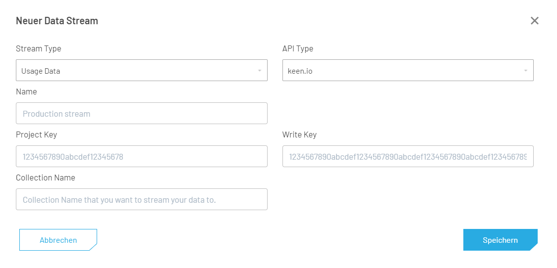 - Stream Type: Choose between Usage Data and Event Data records. If both record types are desired, two separate Data Streams with the different Keen.io projects can be setup.