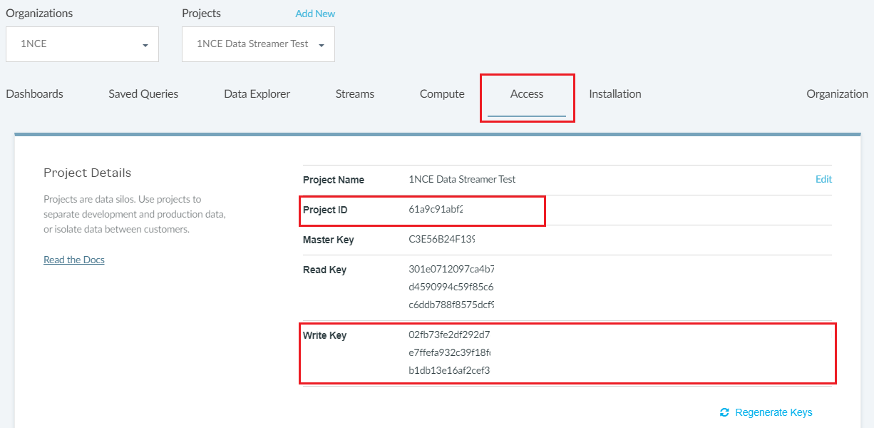 - Open the project page and go to the Access Tab to obtain the Project ID and Write Key from the newly created project.