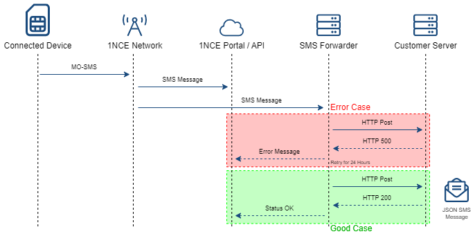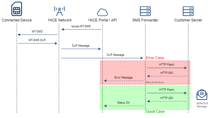 The receiving server needs to provide a REST Interface, which accepts HTTP Post/Patch requests issued from the 1NCE SMS Forwarding Service. MO-SMS from a SIM device are issued using HTTP Post. For MT-SMS towards a SIM device, Delivery Reports are issued with HTTP Patch requests. The server should reply with a HTTP 200 status code. This indicates that the forwarded SMS event was received and will not be repeated afterwards. In case another HTTP status code is returned, the SMS event will be repeated until it is successfully received or a 24-hour timeout is reached.