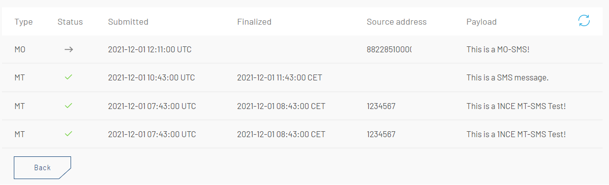 - The list view will show both MT-SMS and MO-SMS messages. For both types, the Status, Submitted, Finalized, Source Address and Payload are shown.