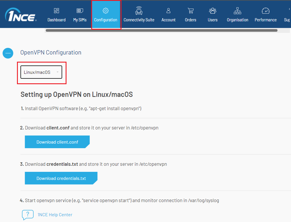 - Log into the 1NCE Portal. Navigate to the Configuration tab and open the OpenVPN Configuration dropdown. Select Linux/MacOS as configuration medium and download the OpenVPN xx-region-x-client.conf and credentials.txt files.