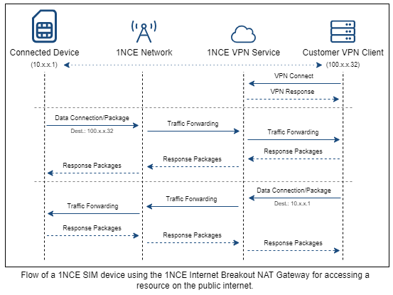 The infrastructure of the 1NCE Data Service network uses Network Address Translation (NAT) to route traffic from each connected SIM device to the public internet. For providing a private, more secure connectivity, as the devices are not directly exposed to the public internet. This also implies that a connection establishment from an application on the internet towards a 1NCE SIM is not directly possible without using the 1NCE VPN Service. On the other hand, target locations in the public internet space can be reached from any device with a 1NCE SIM. The traffic from each device is routed via the 1NCE Internet Breakout. For more details review the 1NCE Network Services, Internet Breakout and VPN Service.