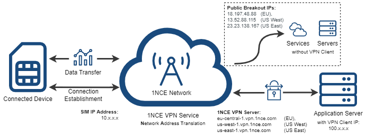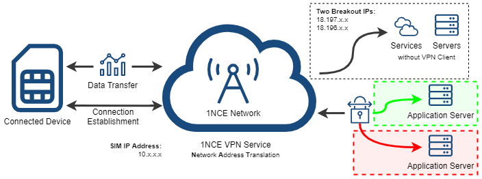 As the 1NCE VPN Service is available in parallel with the normal Internet Breakout connectivity, a device with a 1NCE SIM can still use the normal internet connectivity while the VPN connection is established. This has the benefit that sensitive data can be sent via the VPN endpoint IP address to a server, but general requests (e.g., NTP or public API queries) can be directly done by the device without the need to set up forwarding internet traffic through the VPN connection.