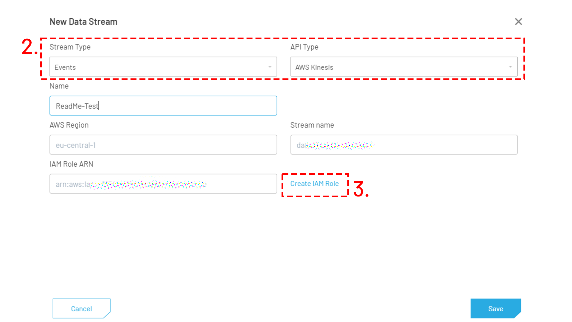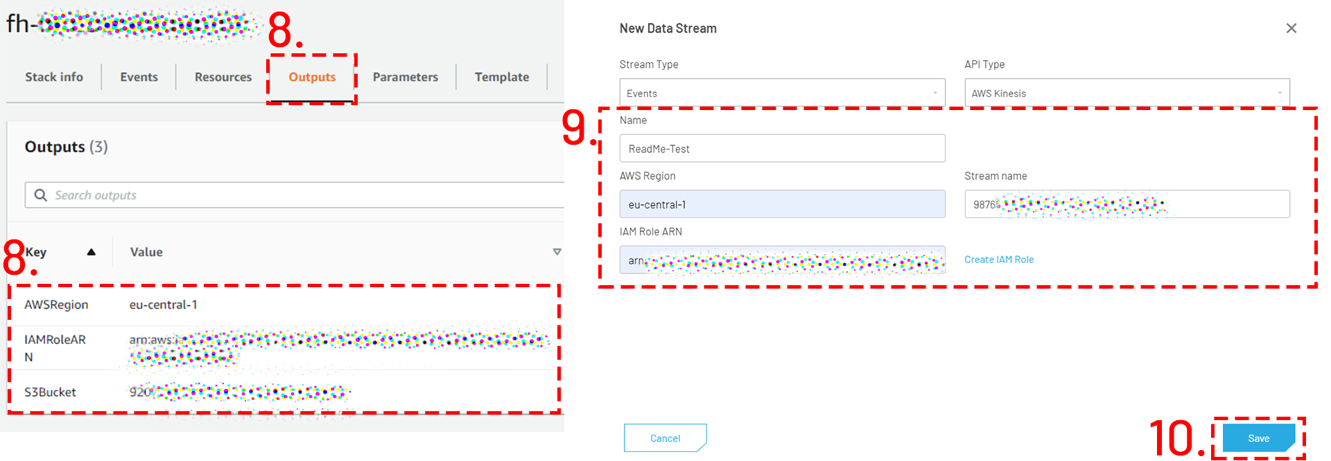 4. Adapt the CFN Template parameters (Stack Name, KinesisStreamName). Do NOT change AllowedExternalID and DatastreamerRoleARN.